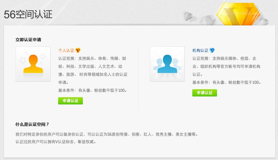 您可以点击这里(链接到//i.56.com/verify.html),选择你要申请的认证类型进行认证申请。