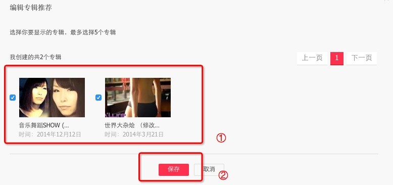 6.2、进入编辑专辑推荐界面:①选择您要推荐的专辑,最多选择5个;②点击“保存”