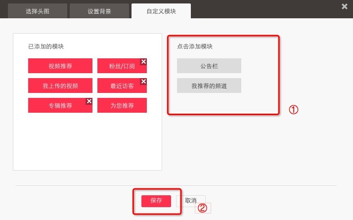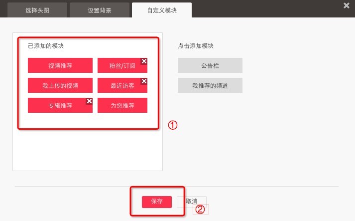 4.1、删除模块:①点击要删除的模块右上角“×”;②点击“保存”。