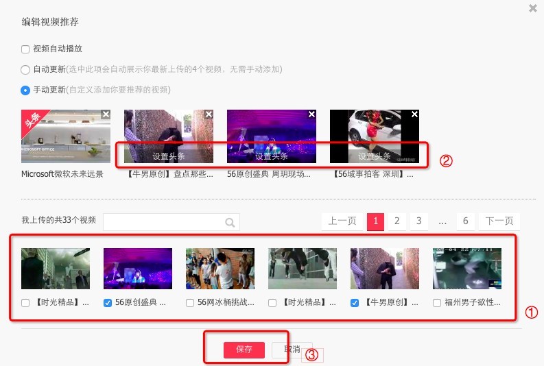 5.2、进入编辑视频推荐界面:①在您上传的视频里面选择要推荐的视频,最多选择4个;②设置头条视频;③点击“保存”。