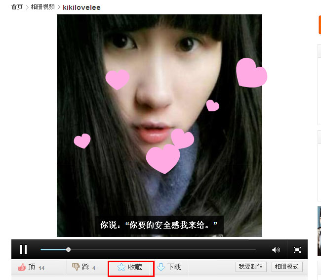 1.2、 收藏相册视频:在相册视频播放页播放器下方点击“收藏”。