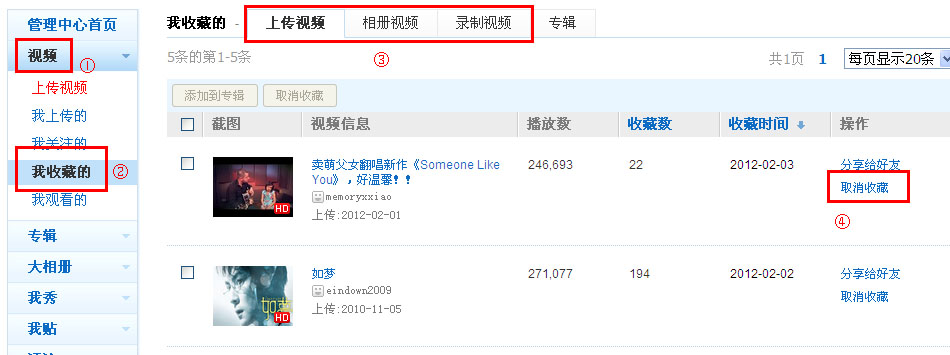 2、 如何管理我的收藏? 登录56,进入管理中心,选择①视频—②我收藏的,就可以看到③你收藏的视频、相册和专辑了。 在这里可以④“取消收藏”。