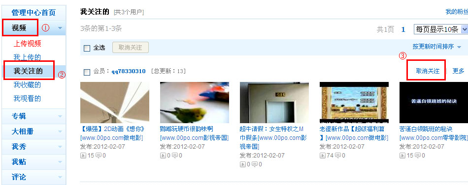 4、 如何管理我的关注? 登录56,进入管理中心,①选择视频,②我关注的。在这里可以看到你关注的人最近更新的视频,还可以③进行取消关注的操作。