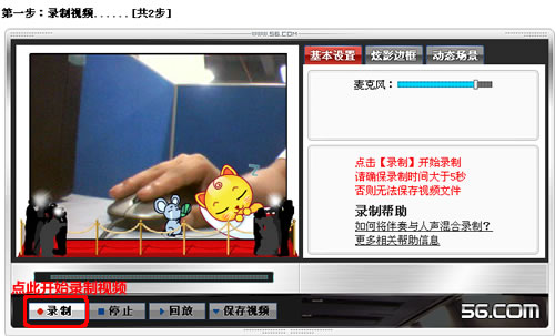请确保您已经安装了最新版本的Flash Player软件,这样才能录制视频。 2.如何在线录制视频? a).在56.com首页登录进入管理中心后,点击“录制新视频”开始录制。如下图:
