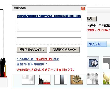 (c):将复制好地址以后,在动感相册制作界面点中“抓取网络图片”,然后点按钮:“点这里开始输入图片地址”打开网络图片抓取界面